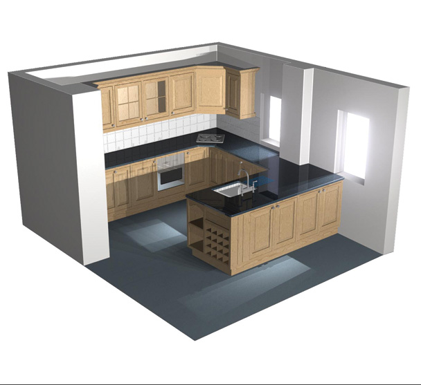 Working with furniture maker James Ellis, a 3D model and visualisation of the proposed bespoke kitchen design was produced to provide the client with a clear idea of spacial layout and finishes.